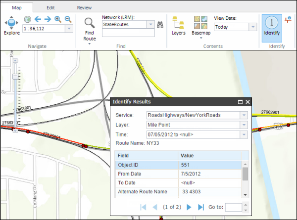 The identified features are highlighted in yellow and their attributes are shown in the Identify Results window.